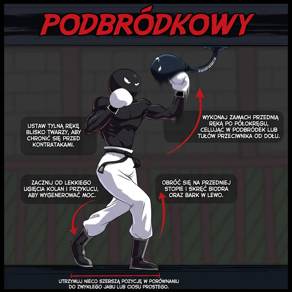Ten cios idzie od spodu — uczy dzieci trzymać nisko pozycję, wyskakiwać w górę i kierować energię w górę. Pomaga budować siłę nóg, prawidłową postawę i wybuchową dynamikę ruchu (w formie zabawy).
